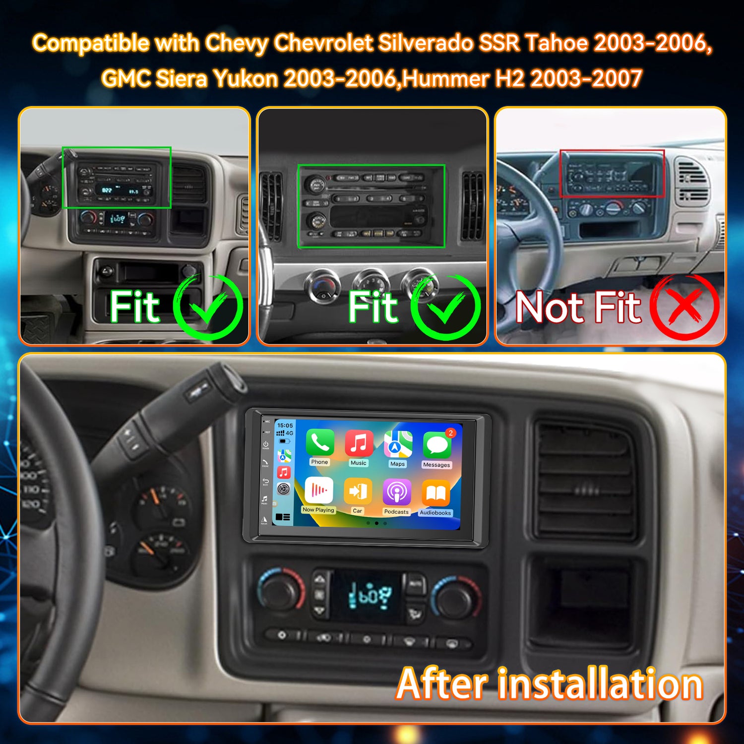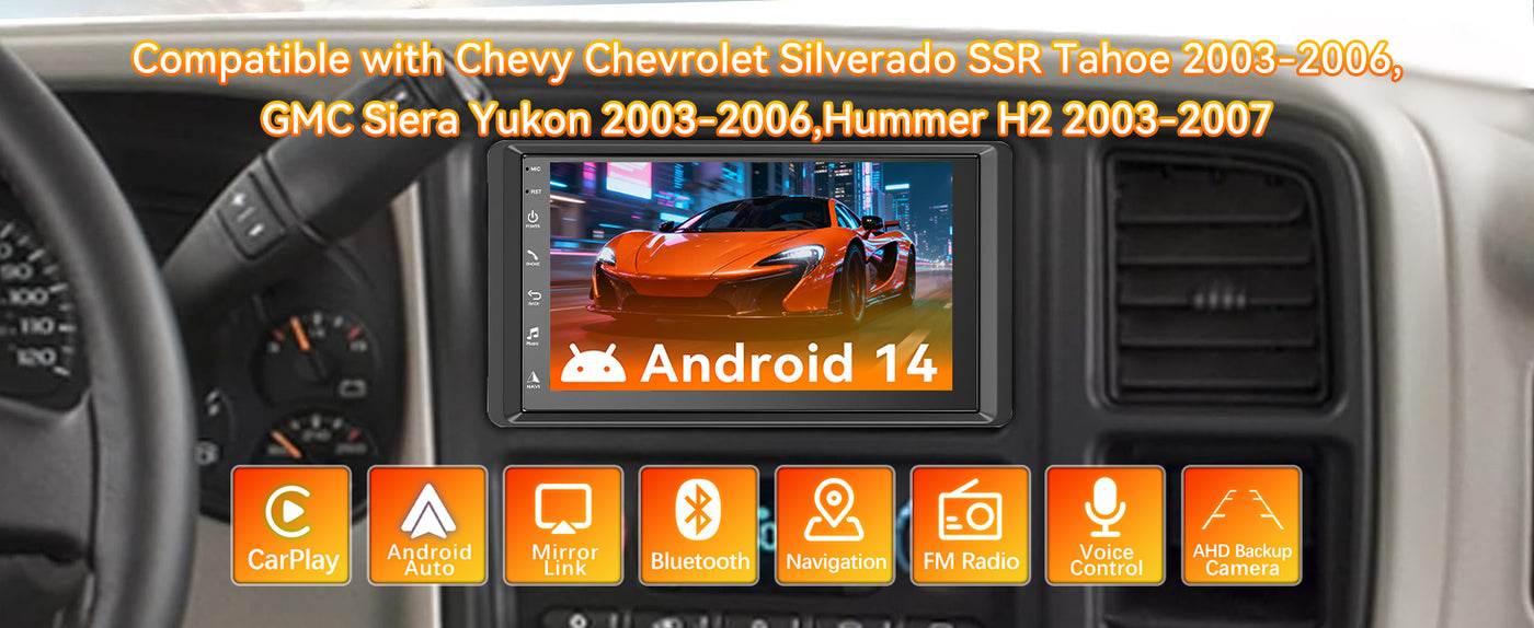 - 【Applicable Car Models】This Android 14 8-core car Radio system is compatible with Chevrolet Chevy Silverado SSR Tahoe 2003-2006, GMC Sierra Yukon 2003-2006, Hummer H2 2003-2006. It comes with all necessary cables for easy installation, requiring no cable cutting. Upgrade your vehicle with our latest Android 14 system! (Please carefully confirm your vehicle model/year/size/style OEM unit and the shape of the center console before purchasing to ensure compatibility.)